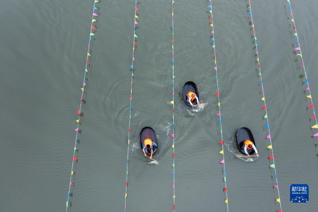 5月28日,在東林鎮(zhèn)保國(guó)村倪家灣港,村民參加“慶端午 劃菱桶”趣味比賽。新華社記者 徐昱 攝