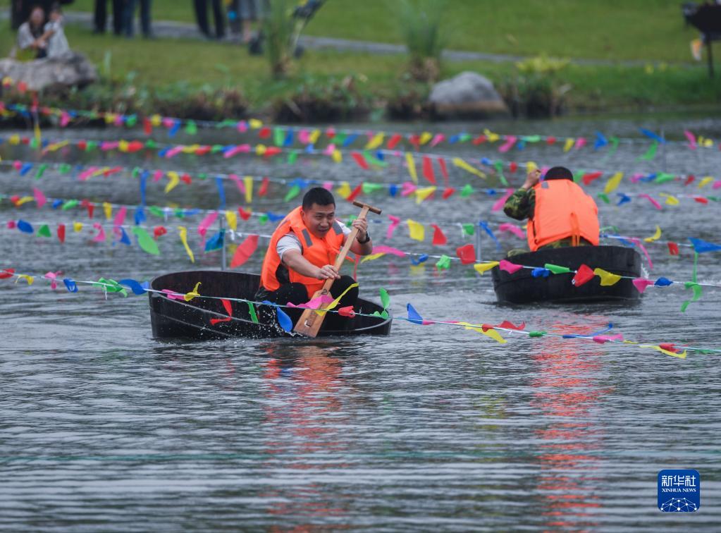 5月28日,在東林鎮(zhèn)保國(guó)村倪家灣港,村民們參加“慶端午 劃菱桶”趣味比賽。新華社記者 徐昱 攝
