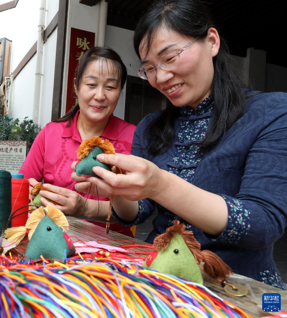 5月28日,安徽省淮北市香包制作手藝人楊海玲(右)在工作室?guī)ьI(lǐng)工人趕制訂單,制作傳統(tǒng)香包。新華社發(fā)(李鑫 攝)