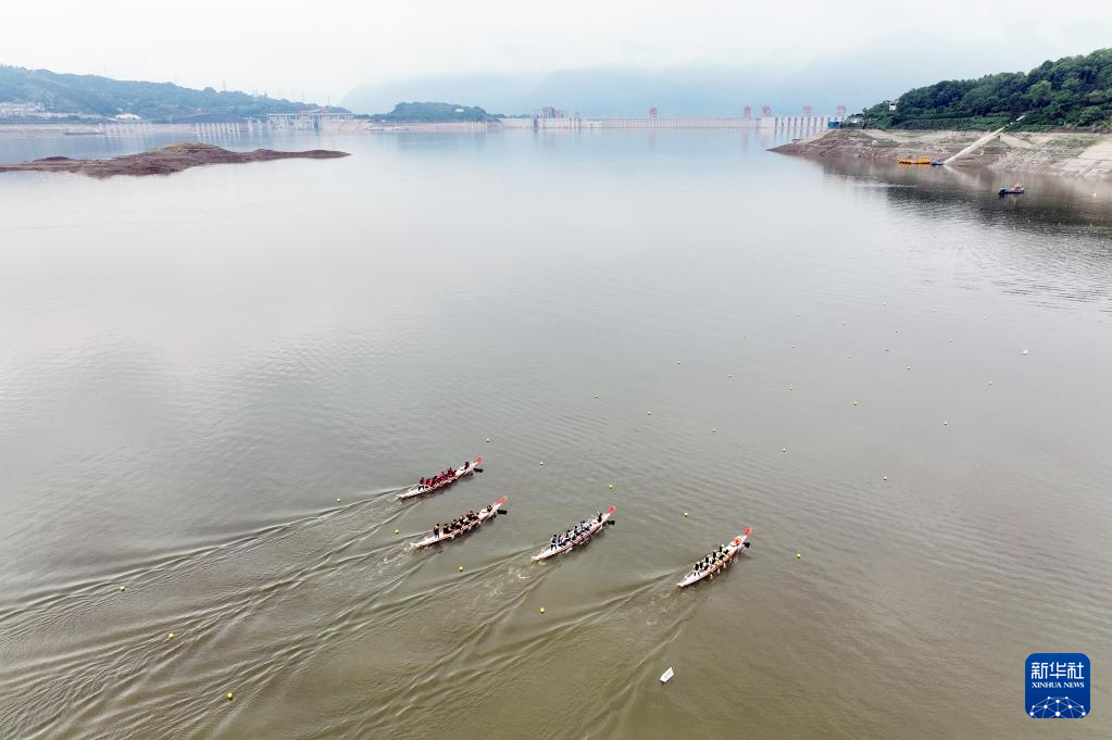 5月28日,在湖北省宜昌市秭歸縣,龍舟選手在三峽大壩附近水域進(jìn)行龍舟比賽(無人機(jī)照片)。新華社發(fā)(王輝富 攝)