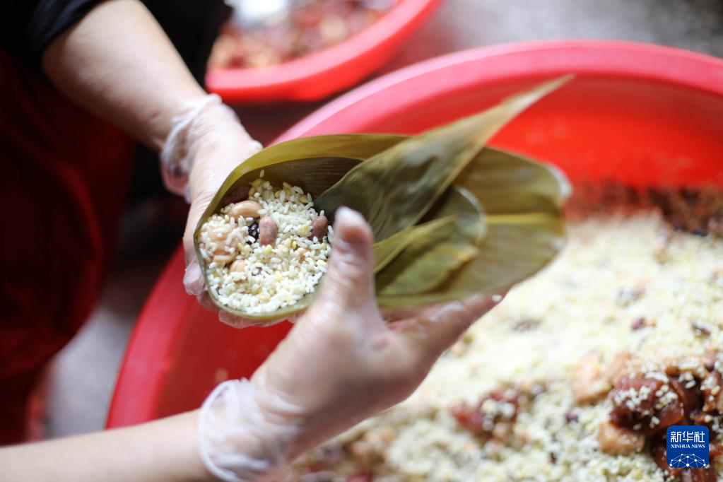 5月28日,湖南省永州市道縣西洲街道西洲社區(qū)的居民在包粽子。新華社發(fā)(何紅福 攝)