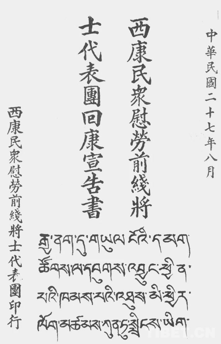 在內(nèi)地期間,代表團(tuán)發(fā)布了《西康民眾慰勞前線(xiàn)將士代表團(tuán)敬告將士書(shū)》《西康民眾慰勞前線(xiàn)將士代表團(tuán)回康宣告書(shū)》,宣傳抗日救亡,號(hào)召康藏廣大民眾積極投入抗日活動(dòng),以多種方式,為抗戰(zhàn)募捐。他們表示,“將西康民眾所捐之來(lái)貢獻(xiàn)中央,將來(lái)任務(wù)完畢回康,即將此次前方同矚實(shí)況,宣告西陲民眾,盡以地方人力物力,在政府指導(dǎo)之下,分期貢獻(xiàn),而為諸位將士之后援,代表等并深以未及走遍各戰(zhàn)線(xiàn)為傷,就此謹(jǐn)祝我全體將士之健康,抗戰(zhàn)勝利萬(wàn)歲!”