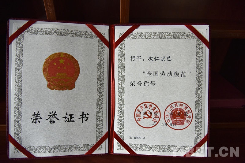 圖為次仁宗巴2015年獲得的“全國(guó)勞動(dòng)模范”榮譽(yù)稱號(hào)證書(shū) 攝影:王媛媛