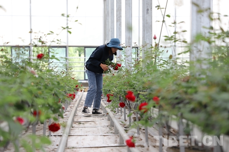 圖為就近就業(yè)的大學(xué)生西洛在玫瑰基地打理玫瑰花 攝影:趙耀