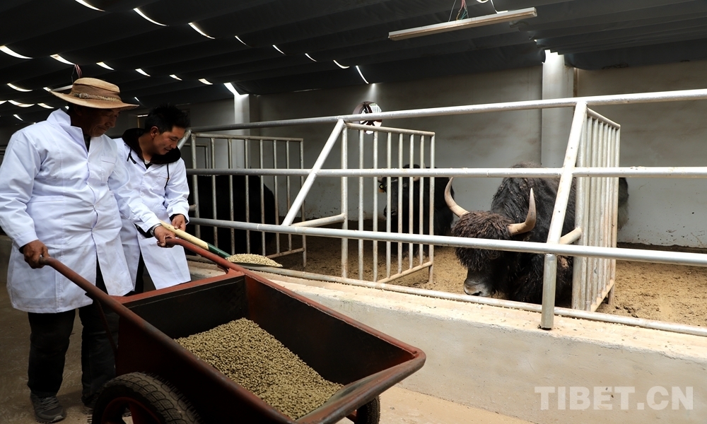 中國(guó)西藏網(wǎng)訊 一鏟鏟飼料倒到食槽內(nèi),牦牛悠閑地慢慢咀嚼。中午時(shí)分,西藏自治區(qū)昌都市類烏齊縣濱達(dá)鄉(xiāng)央宗村的向巴郎加和幾位村民正在當(dāng)?shù)氐年笈6唐谟适痉痘貎?nèi)飼喂近期將要出欄的牦牛。