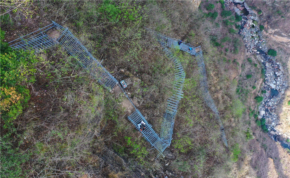 在四川涼山彝族自治州昭覺縣阿土列爾村的懸崖鋼梯上,“懸崖村”村民沿著鋼梯下山(5月13日攝,無人機照片)。新華社記者 王曦 攝