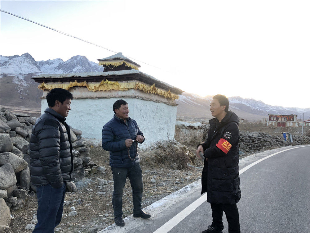 生前擔任甘孜州甘孜縣夏拉卡村駐村第一書記的馬伍薩(右)在巡防路上和村民交流(資料照片)。新華社發(fā)