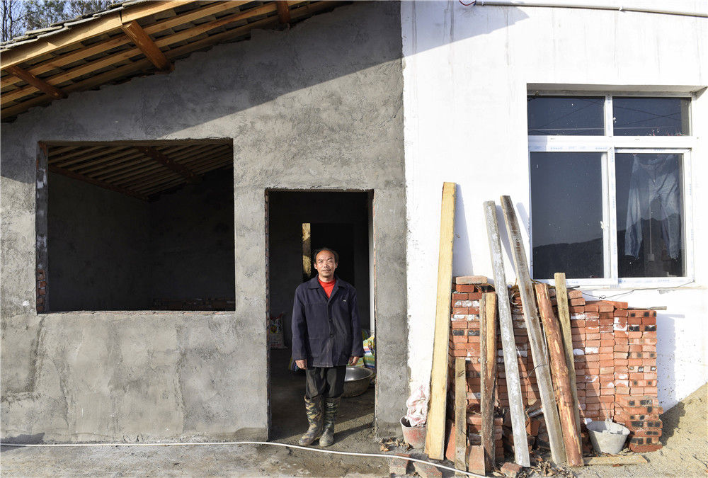 四川巴中市南江縣小田村村民秦發(fā)章在他正在修建的新房前留影(2018年3月20日攝)。新華社記者 劉坤 攝