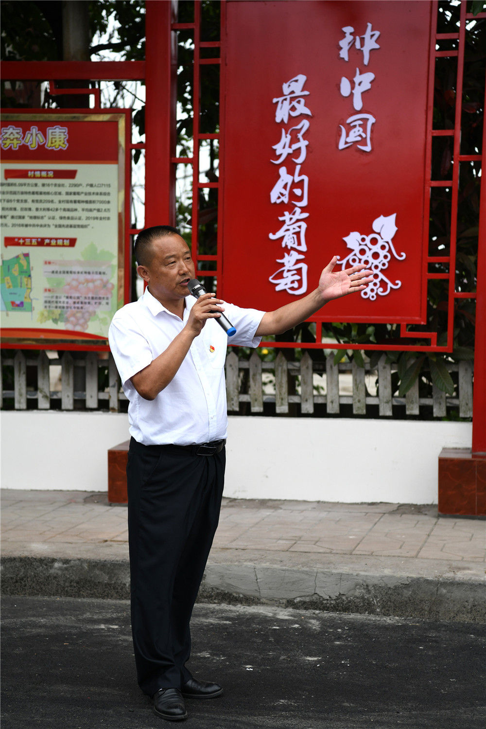 在四川省眉山市彭山區(qū)果園村,村黨總支書記李永偉在介紹果園村葡萄產(chǎn)業(yè)發(fā)展情況(6月11日攝)。新華社記者 王曦 攝