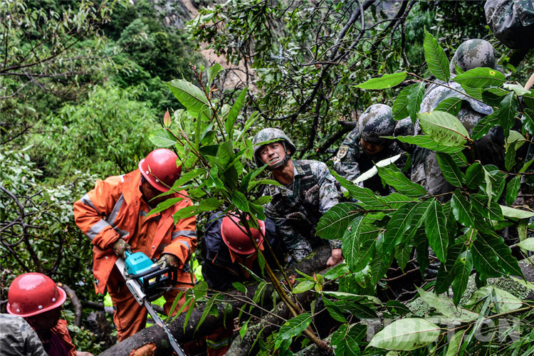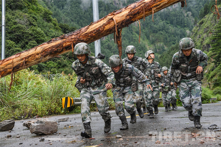 “山體滑坡帶下來的亂石和粗大的樹干擋住了去路,塌方面積不大,現(xiàn)在挖掘機正在作業(yè),跟當?shù)厝藛T溝通,他們說預(yù)計下午能搶通?!?巴桑爬上塌方的亂石堆觀察后,跑回來跟帶隊的副營長張為鵬報告情況。