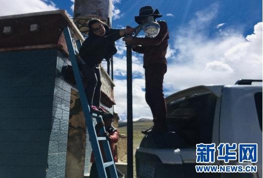 牧民群眾積極與駐村工作隊的太陽能路燈安裝工作。新華網(wǎng)發(fā) 旦增卓瑪攝