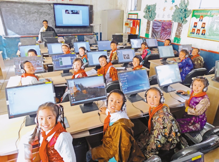 圖為西藏自治區(qū)日喀則市南木林縣完全小學(xué)的學(xué)生在上計算機(jī)課 攝影:楚武干