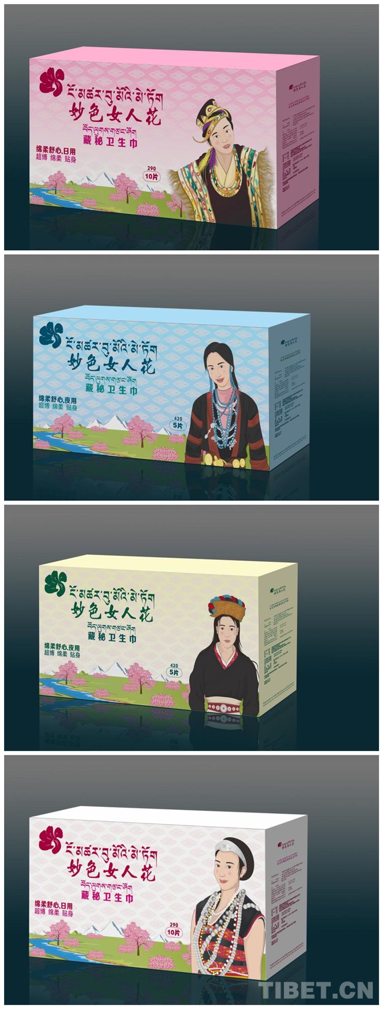產(chǎn)品的包裝設(shè)計(jì)歷經(jīng)4個(gè)版本,拉巴次仁最終選定了身著傳統(tǒng)服飾的工布藏族、珞巴族、門巴族、僜人女性漫畫形象,他認(rèn)為這樣最能代表林芝女性的風(fēng)采。