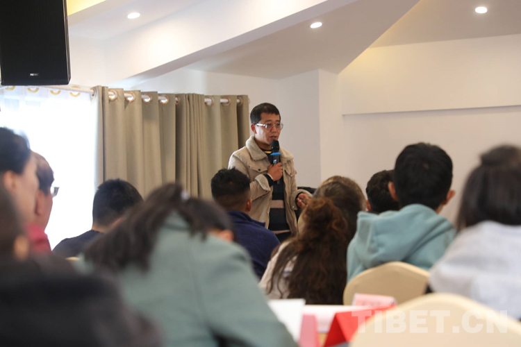圖為拉巴次仁在林芝市人社局主辦的大學(xué)生“職來職往”現(xiàn)場招聘會上,作為創(chuàng)業(yè)代表分享創(chuàng)業(yè)經(jīng)驗(yàn)