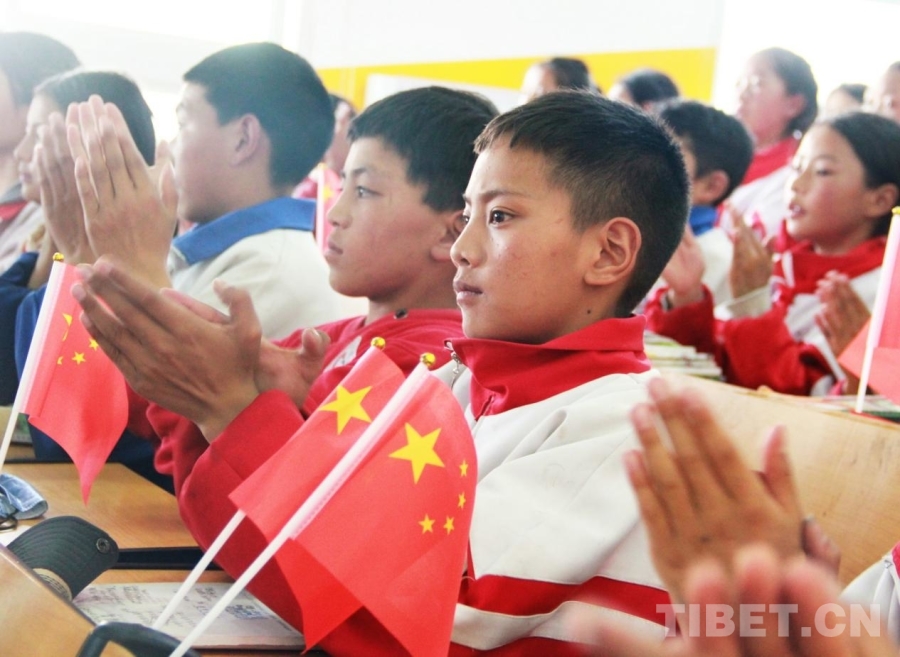 圖為四川省甘孜州石渠縣第二完全小學(xué)學(xué)生代表與醫(yī)療專家們一起高唱國歌 攝影:劉莉