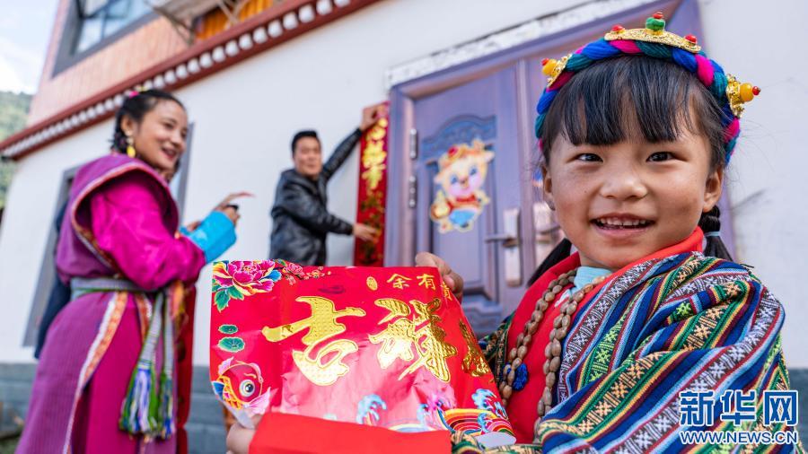 在西藏林芝市墨脫縣,張淳煥一家三口在家門(mén)前貼對(duì)聯(lián)(2月11日攝)。新華社記者 孫非 攝