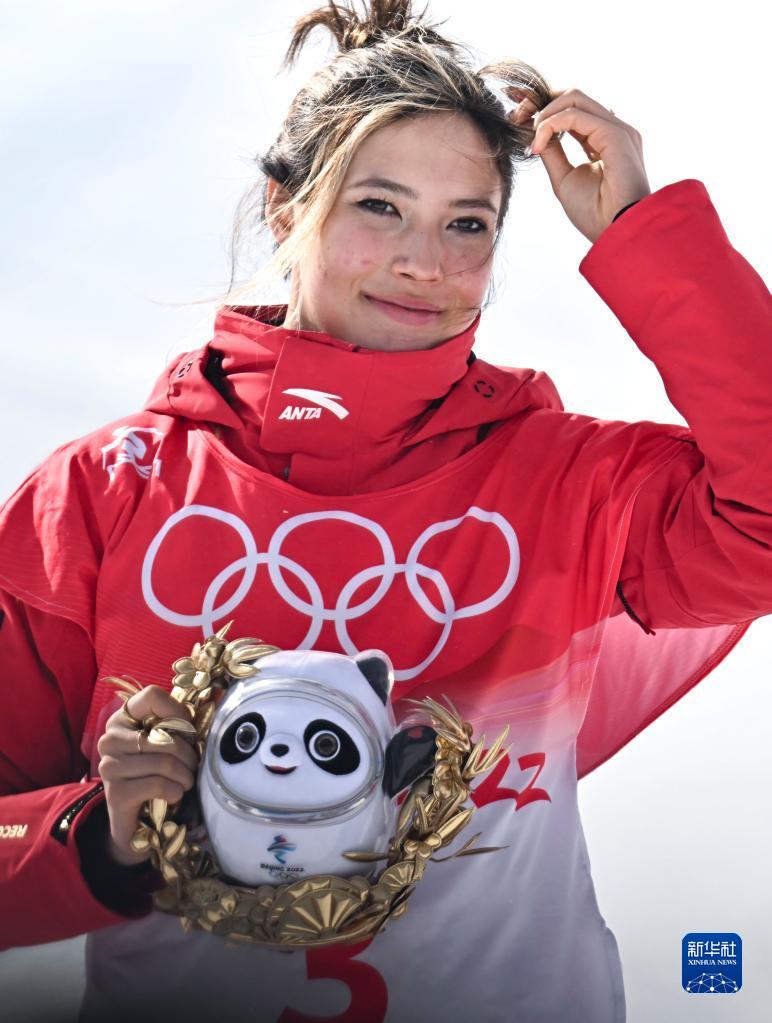 2月15日,中國(guó)選手谷愛凌在頒發(fā)紀(jì)念品儀式上。新華社記者 肖藝九 攝
