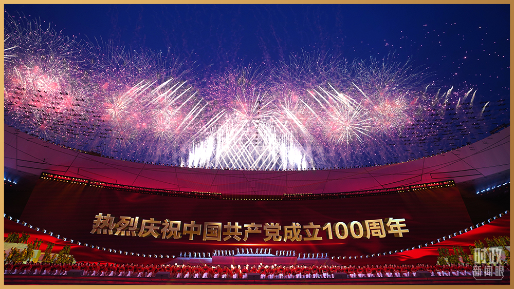情景交響歌舞《人民至上》,再現(xiàn)舉國動員、全民戰(zhàn)“疫”。鼓樂歌舞節(jié)目《新的天地》,一百面空中大鼓與地面巨型大鼓遙相呼應。在主題曲《領航》的旋律中,高達16米的金色黨徽在國家體育場莊嚴升起。演出過程中,絢爛的焰火一次次盛放在國家體育場上空,并迅速在網(wǎng)上引發(fā)刷屏。