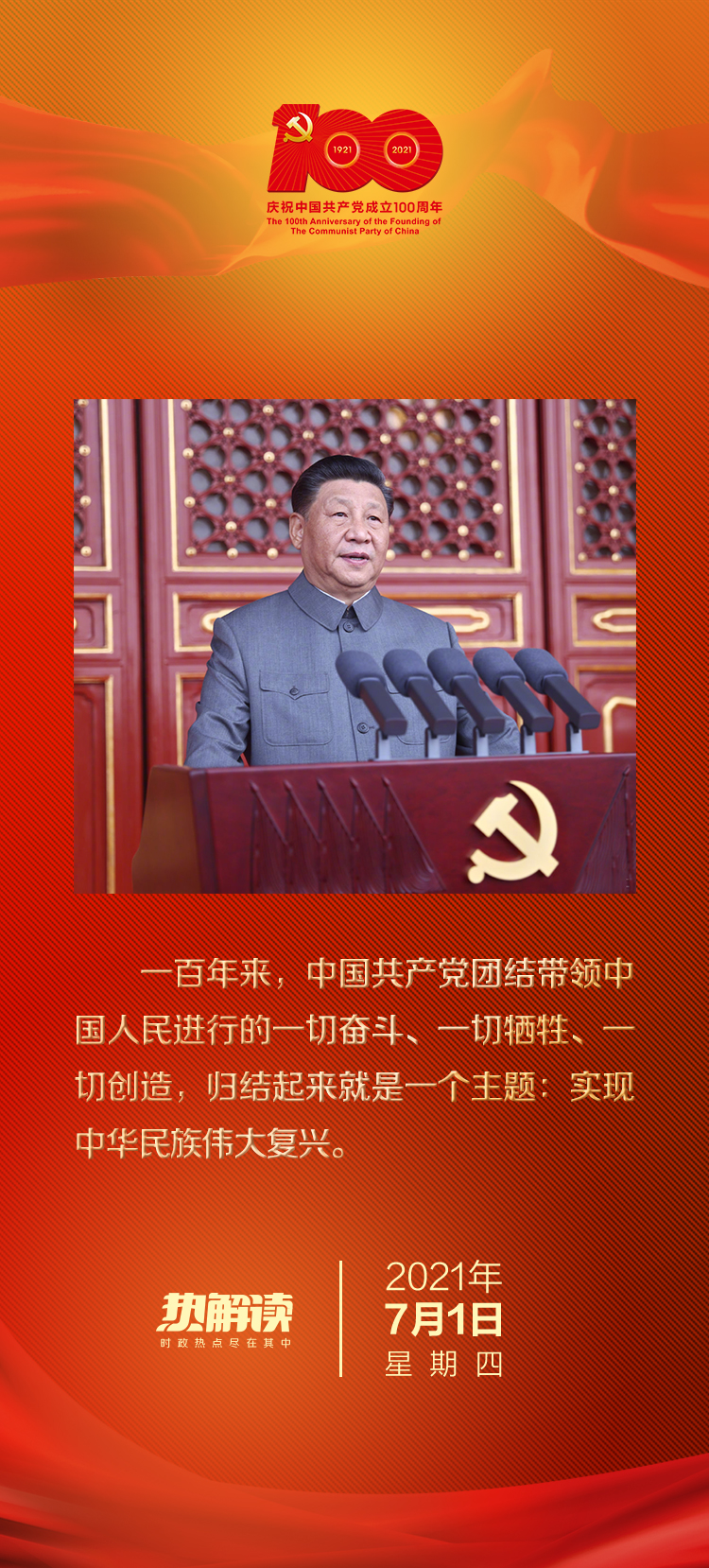 “一百年來,中國共產黨團結帶領中國人民進行的一切奮斗、一切犧牲、一切創(chuàng)造,歸結起來就是一個主題:實現中華民族偉大復興。”習近平總書記的精辟論述,高度概括了中國共產黨百年歷史。