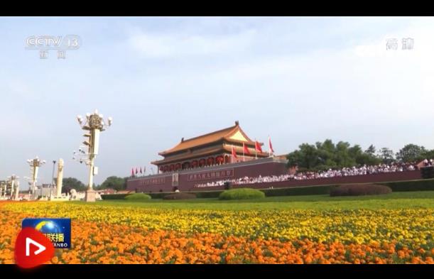 7點53分,習近平等黨和國家領導人來到天安門城樓主席臺。隨后,中國人民解放軍71架戰(zhàn)機飛向天安門廣場。