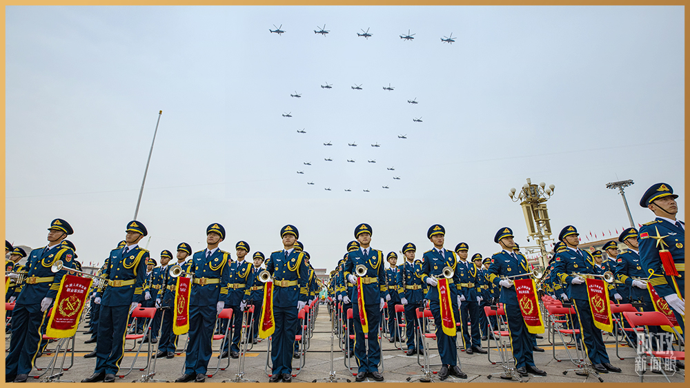 29架直升機組成“100”字樣掠過長空。(總臺記者廖江衡拍攝)