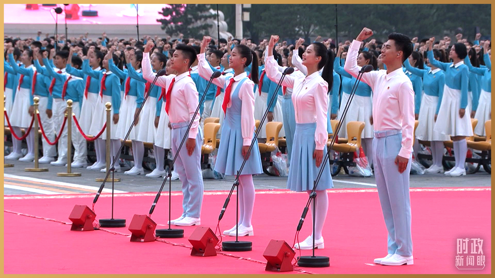 8點整,慶祝大會開始。100響禮炮響徹云霄?,F場升國旗、奏唱國歌。此后,各民主黨派、工商聯(lián)和無黨派人士聯(lián)合致賀詞,由共青團員和少先隊員組成的千人方陣集體致獻詞。