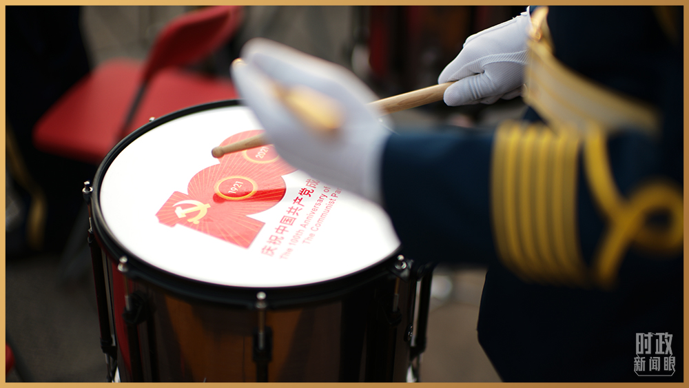 鼓面上帶有建黨百年慶?;顒訕俗R(總臺央視記者彭漢明拍攝)