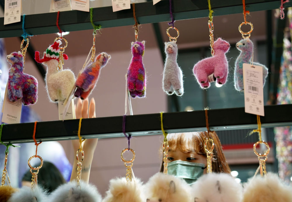 在進(jìn)博會(huì)馬玉霞的展位拍攝的用秘魯羊駝毛制作的掛件(11月6日攝)。(新華社記者劉穎攝)