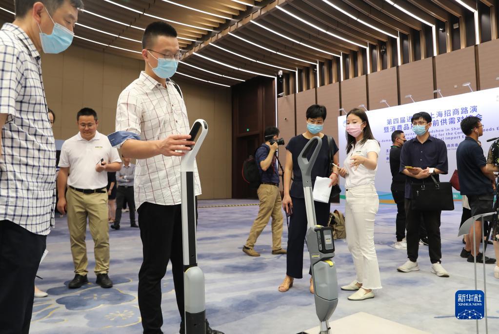 第四屆進博會上海招商路演暨消費品展區(qū)展前供需對接會在國家會展中心(上海)舉行,一家德國企業(yè)在對接會現(xiàn)場展出的清潔產(chǎn)品吸引參會嘉賓觀看(7月15日攝)。新華社記者 方喆 攝