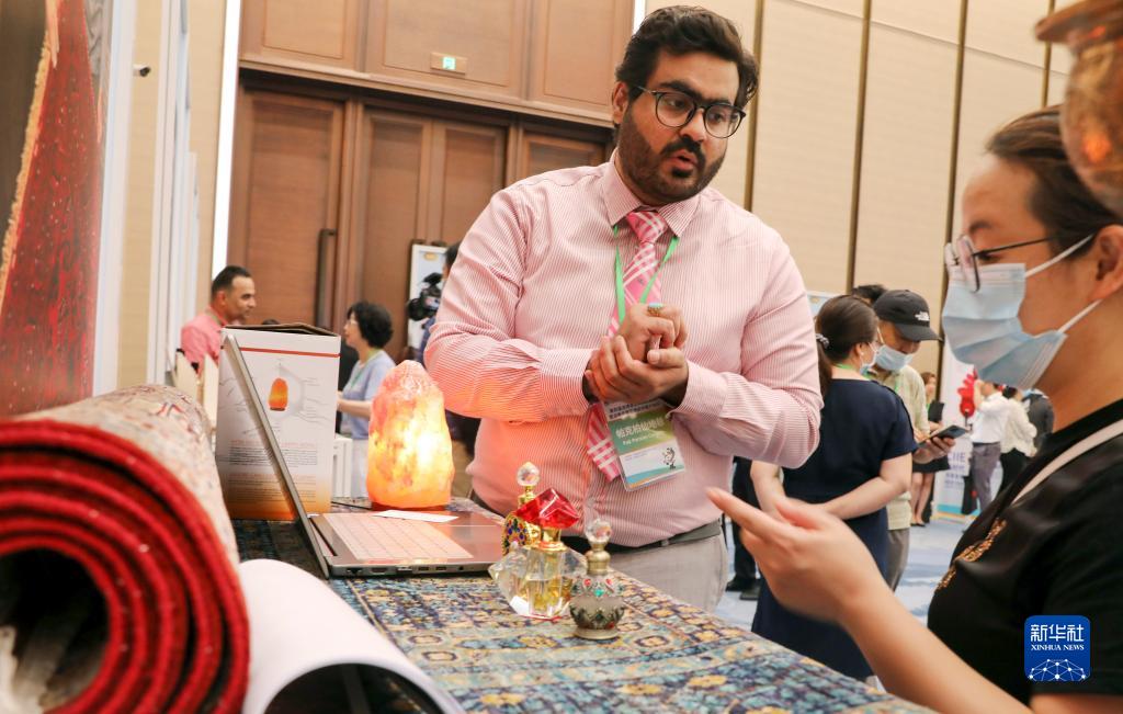 在國家會展中心(上海),參加第四屆進博會上海招商路演暨消費品展區(qū)展前供需對接會的一名參展企業(yè)工作人員(左)向參會嘉賓介紹產(chǎn)品(7月15日攝)。新華社記者 方喆 攝