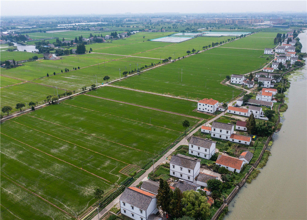 空中俯瞰浙江省嘉興市嘉善縣西塘鎮(zhèn)紅菱村的連片稻田和美麗村居(7月13日攝,無人機(jī)照片)。新華社記者 徐昱 攝