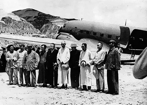 1945年7月,國民參政會參政員黃炎培等六人飛抵延安,同中國共產黨商談兩黨團結、共建國內和平問題,毛澤東等親臨機場歡迎。 圖:新華社