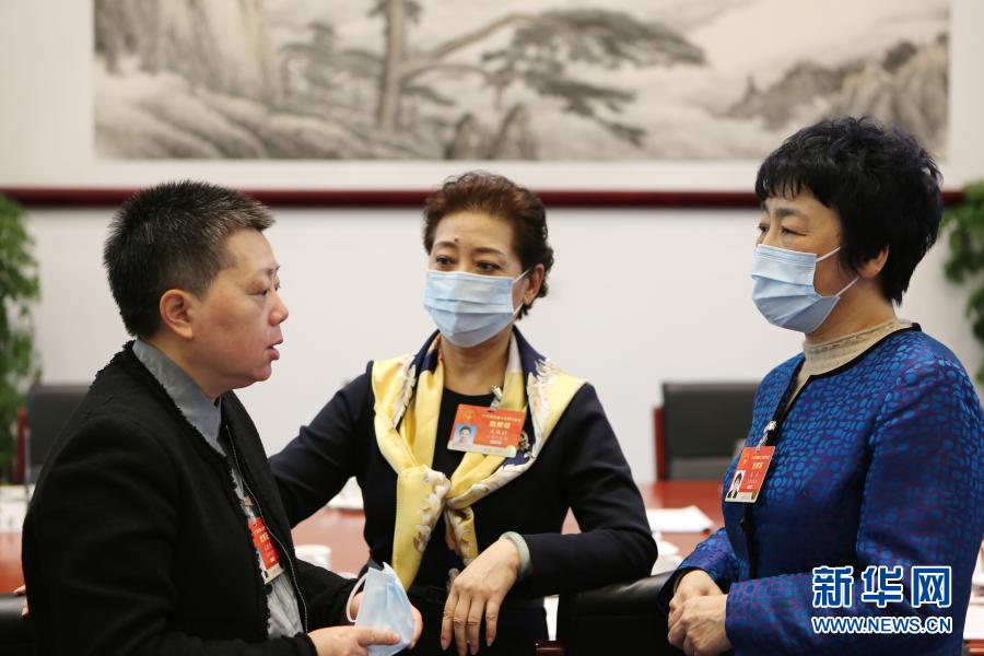 3月6日,十三屆全國(guó)人大四次會(huì)議天津代表團(tuán)的孔曉艷代表(左)、關(guān)牧村代表(中)和馬杰代表在會(huì)議間隙交流討論。新華社記者 吳雨 攝