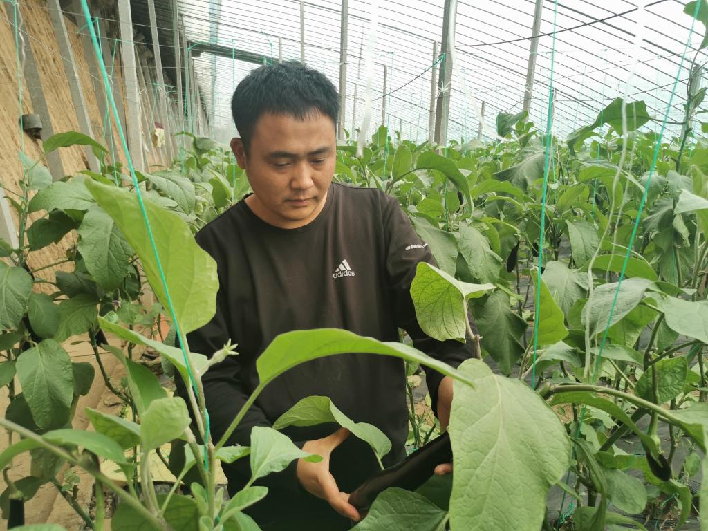 王聰在大棚里打理茄子。(新華社記者張力元 攝)