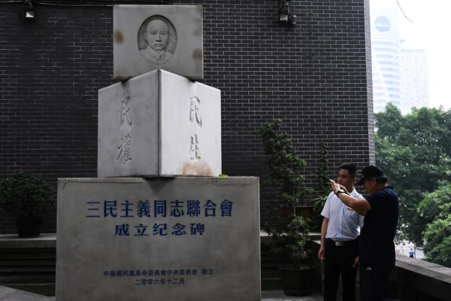 6月21日,媒體記者在位于重慶的中國民主黨派歷史陳列館參觀“三民主義同志聯(lián)合會成立紀(jì)念碑”。