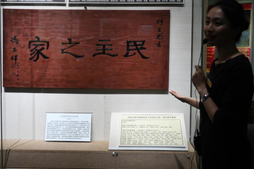 6月21日,在位于重慶的中國民主黨派歷史陳列館內(nèi),工作人員向媒體記者介紹展陳的“民主之家牌匾”。