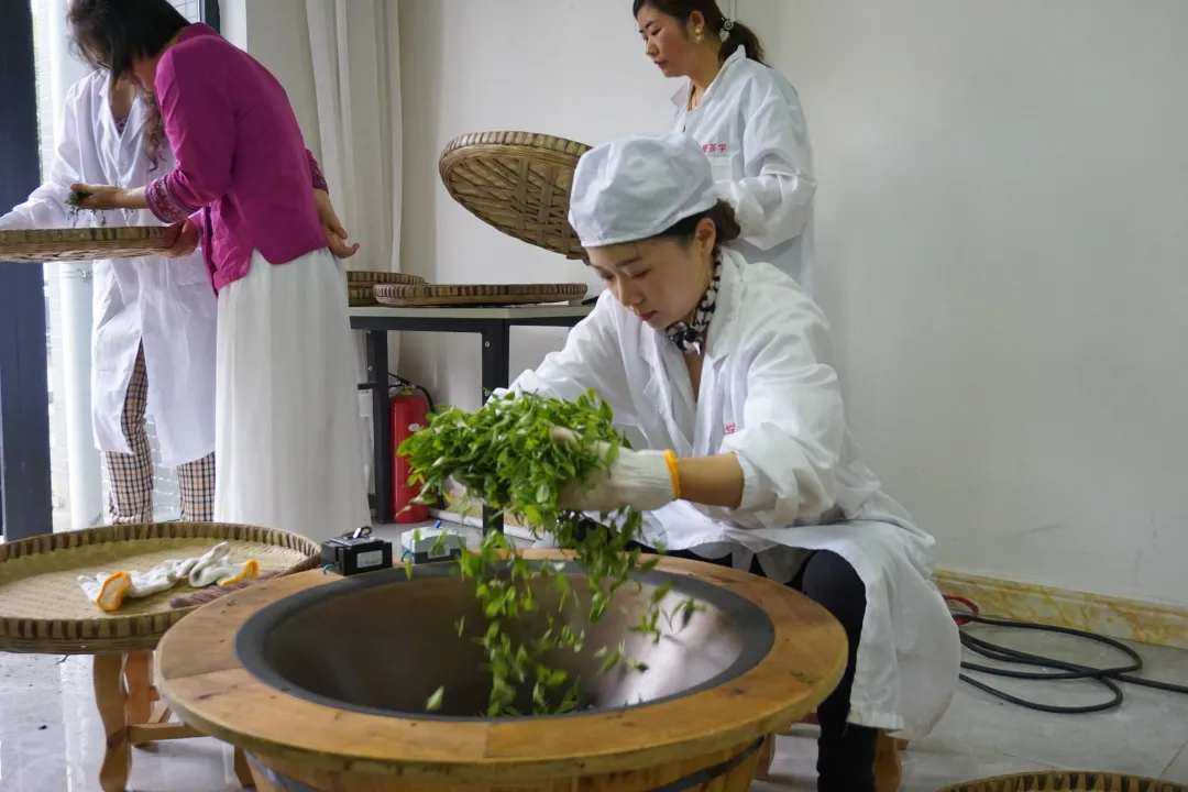 在相隔不遠(yuǎn)的華夏茶藝培訓(xùn)學(xué)校里,幾名茶藝師現(xiàn)場展示高品質(zhì)茶葉制作的工藝流程?!安枞~殺青一般是5到7分鐘,殺透了以后就會(huì)把茶葉原有的活性酶等固定在里面?!辈杷噹熈沃炀髦鴮S檬痔?,坐在溫度超過200攝氏度的炒茶鍋邊給茶葉殺青。此前,臺(tái)盟成都市支部建立了“兩岸同耕”鄉(xiāng)建文創(chuàng)工作室,邀請臺(tái)灣的制茶師在夾關(guān)鎮(zhèn)開展制茶工藝研習(xí)活動(dòng)。
