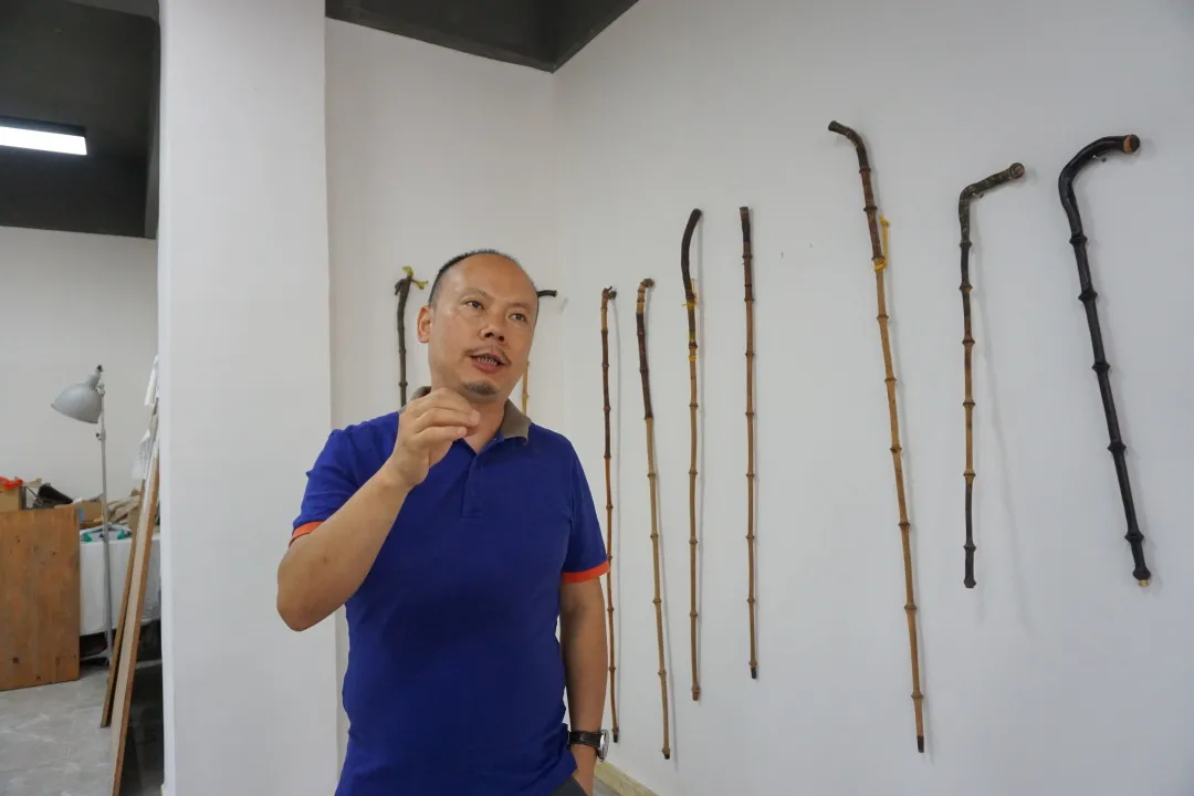 “我們考證了歷史文獻(xiàn)上的圖形,按照古人的圖譜,通過加熱來做出彎曲的造型?!壁w彌指向固定在墻上的筇竹杖,介紹“筇竹杖”背后蘊(yùn)含的文化及它在今時(shí)今日的意義,他詳細(xì)描述了筇竹杖漫長的制作流程,在正式制作前,要收集生長6年左右的竹子放在通風(fēng)陰涼的地方一年之久,來自然揮發(fā)掉內(nèi)部的水分糖分。