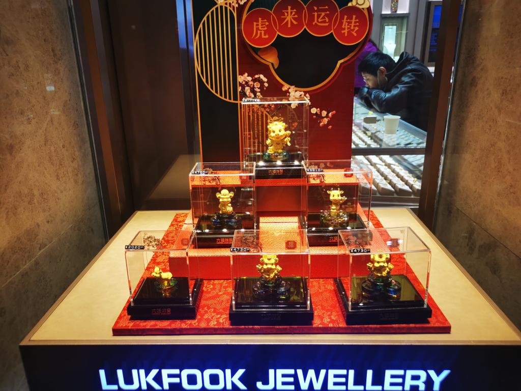春節(jié)假期,黃金消費(fèi)市場也迎來旺季。為了把握虎年開門紅,各大金飾品牌不約而同推出虎年金幣、金虎擺件、?;⒌鯄嫛⑹宙湹葢?yīng)時(shí)應(yīng)景新品。廣州天河城百貨一層聚集著各大金飾品牌數(shù)十個專柜,虎年賀歲飾品成為春節(jié)前后最受歡迎的產(chǎn)品。“老虎意頭好,很多人愿意開年買求個好運(yùn),再加上相比去年,今年的金價(jià)有所下滑,我們也加大了打折促銷的力度,多重因素推動春節(jié)期間生肖金飾銷售火爆?!睂9皲N售人員告訴記者。