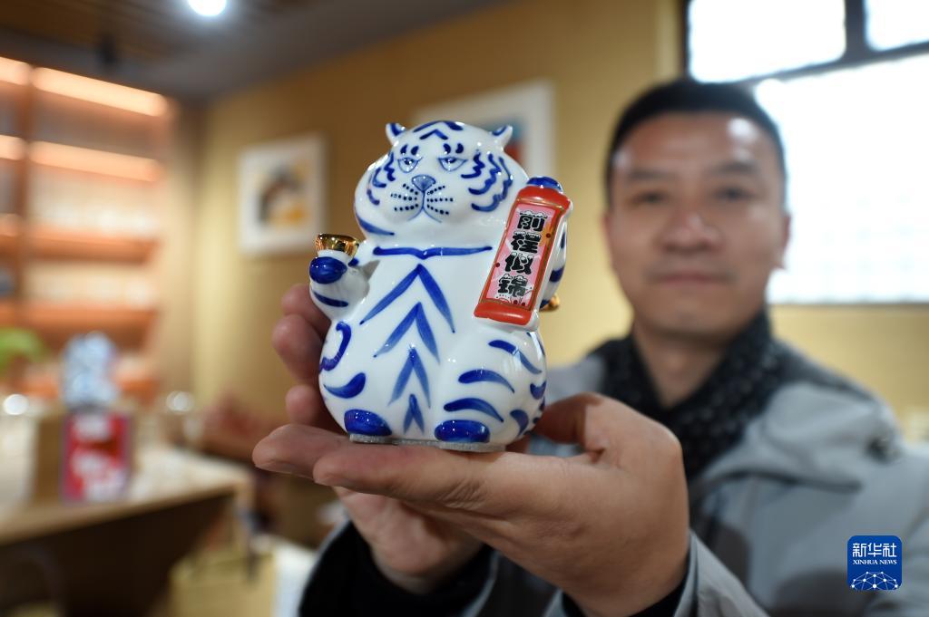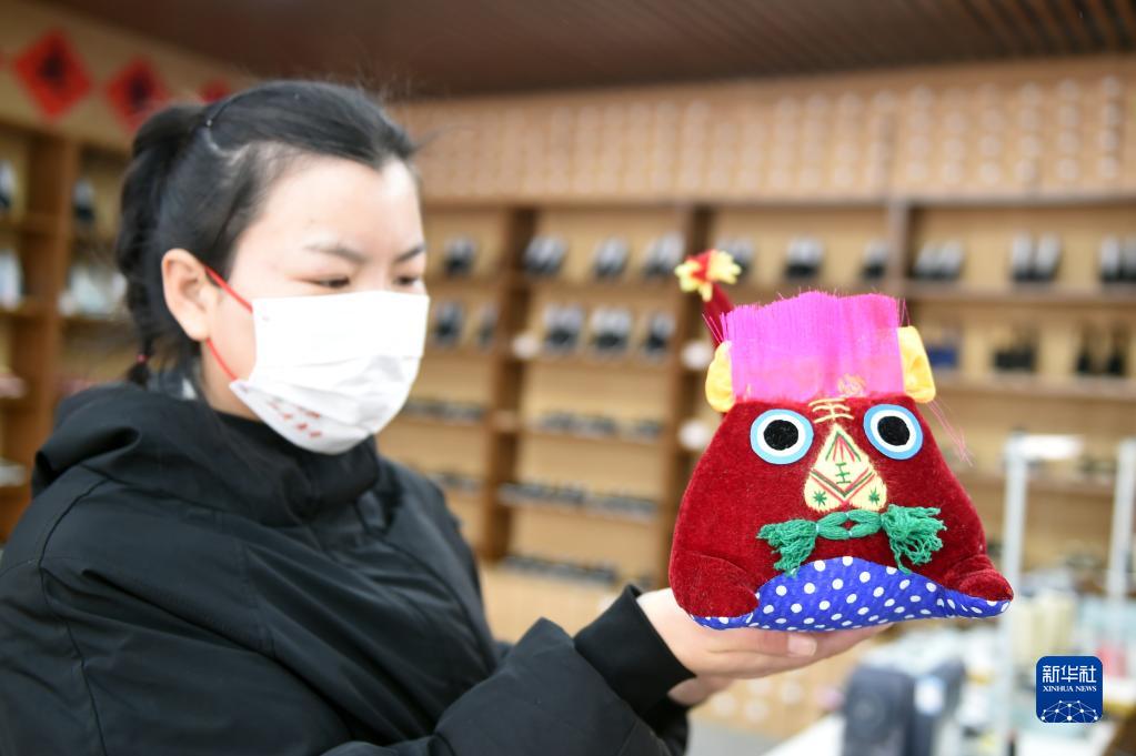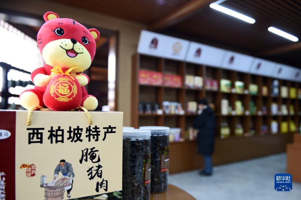 1月28日,在河北省平山縣西柏坡鎮(zhèn)北莊村西柏坡文創(chuàng)館,工作人員展示特色文創(chuàng)產品。新華社記者 駱學峰 攝