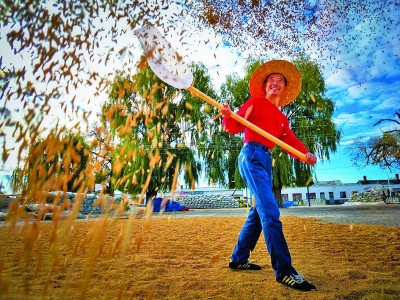 黑龍江寧安市渤海鎮(zhèn)上官地村水稻喜獲豐收,稻農在晾曬場工作。王志軍攝