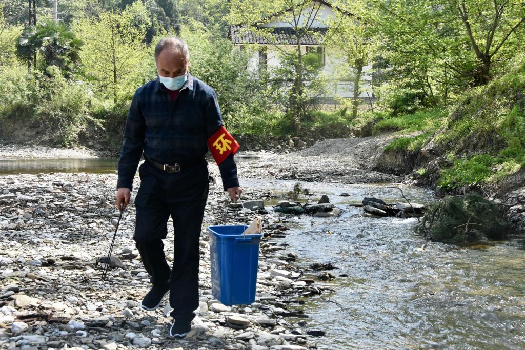 漢水源村村民聶友松正在河道上撿拾垃圾。新華社記者鄭昕攝
