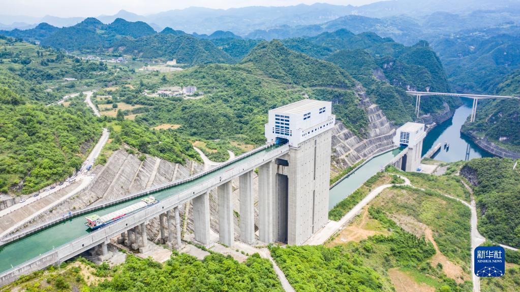 2021年6月投入試運(yùn)行的構(gòu)皮灘水電站配套的通航工程,被視為貴州通江達(dá)海的關(guān)鍵。構(gòu)皮灘通航水頭高差達(dá)199米,采用三級垂直升船機(jī)運(yùn)行,船只通過烏江構(gòu)皮灘水電站都要搭乘“水上電梯”,呈現(xiàn)出“水在空中懸,船在天上行”的奇景。