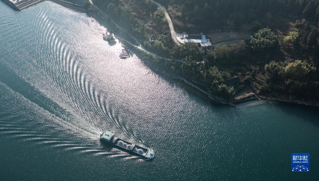 運(yùn)載磷礦石的貨船沿烏江航道順流航行,從石阡縣河閃渡碼頭旁駛過(2021年11月18日攝,無人機(jī)照片)。新華社記者 陶亮 攝
