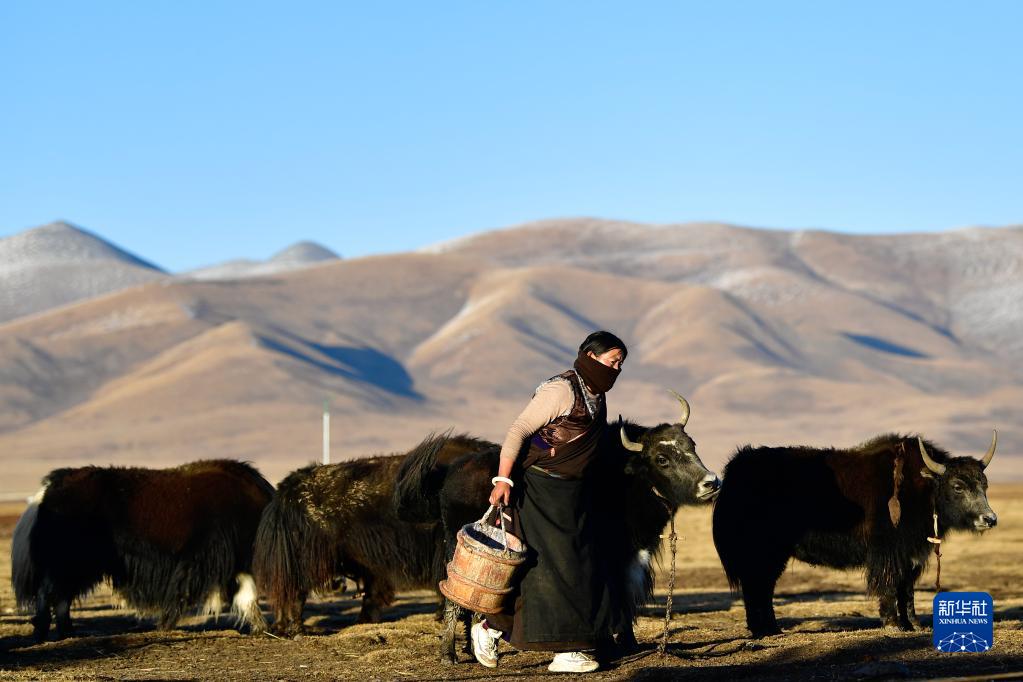 青海省玉樹(shù)藏族自治州稱多縣珍秦鎮(zhèn)二村牧民扎西德藏準(zhǔn)備給牦牛擠奶(2020年10月28日攝)。新華社記者 張龍 攝