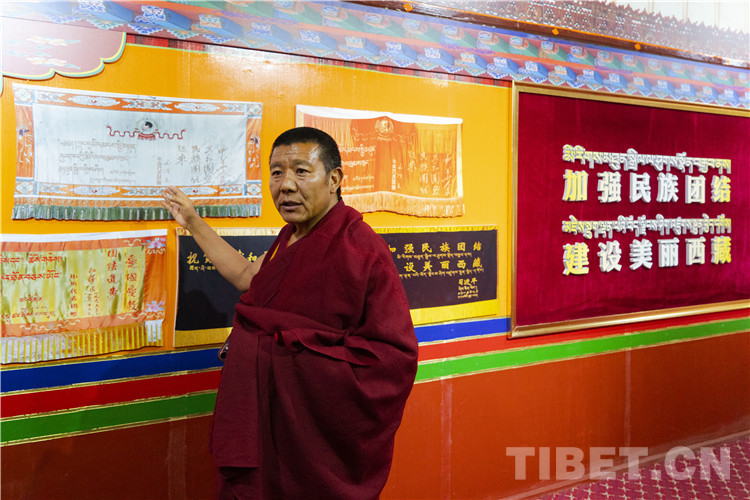 圖為扎什倫布寺管委會(huì)副主任賽巴·多布瓊在該寺民族團(tuán)結(jié)和愛(ài)國(guó)主義教育基地講解 攝影:趙振宇
