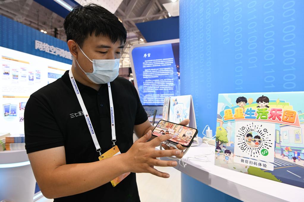 參展人員在2022年中國網(wǎng)絡(luò)文明大會上展示一款為孤獨癥兒童開發(fā)的功能性應(yīng)用軟件。新華社記者孫凡越 攝