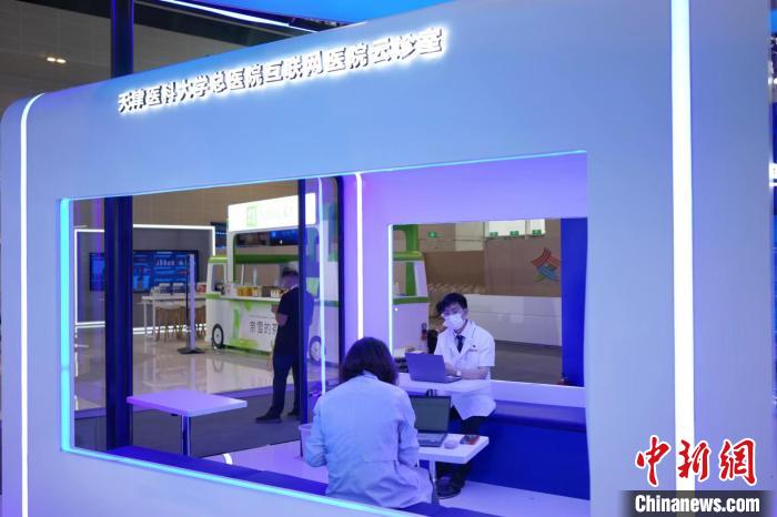 在天津醫(yī)科大學總醫(yī)院展廳,醫(yī)生在“云診室”通過互聯(lián)網(wǎng)醫(yī)院接診患者。記者了解到,在大會上,天津醫(yī)科大學總醫(yī)院宣布與科瑞泰醫(yī)療信息技術(shù)(天津)有限公司、360數(shù)字安全集團天津公司、銳捷網(wǎng)絡(luò)股份有限公司、中國移動通信集團天津有限公司等開展合作,共同開啟互聯(lián)網(wǎng)醫(yī)院醫(yī)聯(lián)體“1236N”醫(yī)療健康服務(wù)新體系的建設(shè)之路。