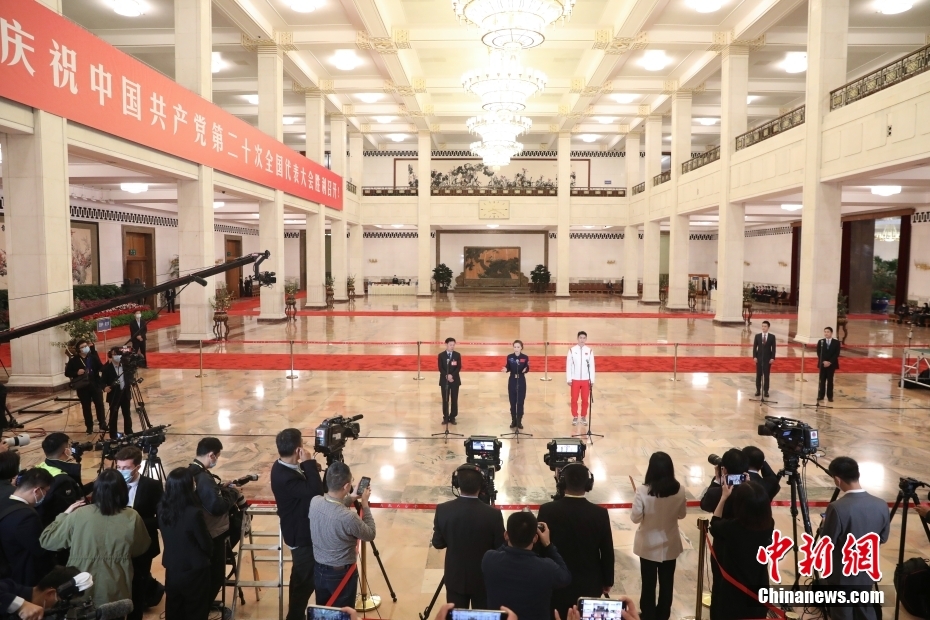 10月16日,中國共產(chǎn)黨第二十次全國代表大會在北京人民大會堂開幕。大會開幕前,舉行“黨代表通道”采訪活動。圖為姜麗娟、孫金龍、於若飛代表(自左至右)接受采訪。 中新社記者 蔣啟明 攝