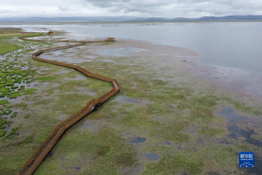 這是在甘肅省甘南藏族自治州碌曲縣拍攝的尕海湖(無(wú)人機(jī)照片,2021年6月2日攝)。新華社記者 杜哲宇 攝